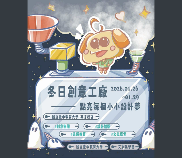 一、為了從小培養孩童在生活探索、美學設計與文化認識層面的能力及視野,本校文創學系辦理《2026冬日創意工廠─點亮每個小小設計夢》冬令營活動。讓我們打開感官一起體驗!
