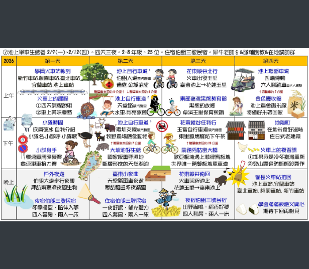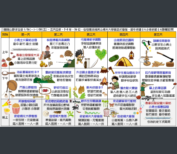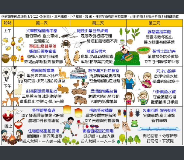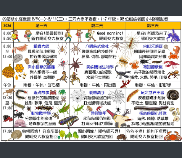 一、2026生態素養冬令營日期1/24~2/12,招生一-九年級學員,依不同課程分齡參加,詳細請見營隊課程網站https://www.i3nature.com.tw/ 。