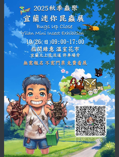 五、2025秋季主辦宜蘭迷你昆蟲展Bugs Up Close Yilan MiniInsect Exhibition,2025/10/26(日)地點在宜蘭交流道旁指間綠意溫室花市,歡迎免費參觀,現場贈送獨家【兜與鍬大海報】尺寸60*84公分。