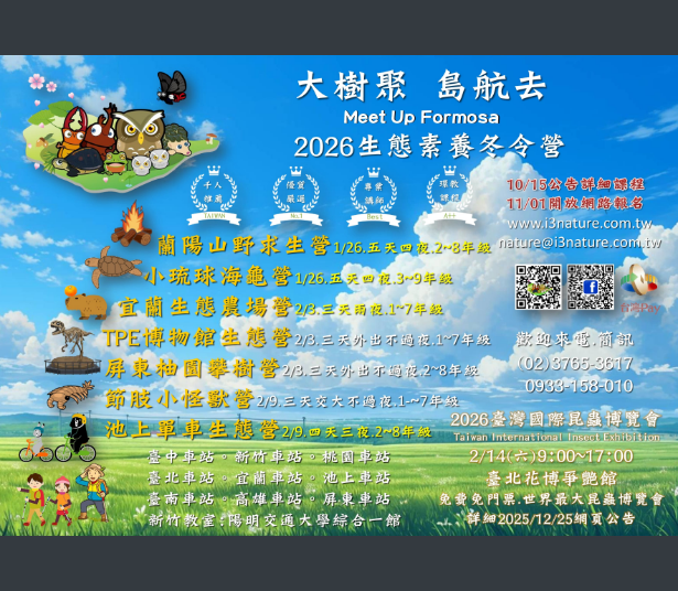 愛上大自然文教將於115年寒假辦理【大樹聚 島航去】2026生態素養冬令營共七個梯次,暨參展2026第七屆臺灣國際昆蟲博覽會活動。