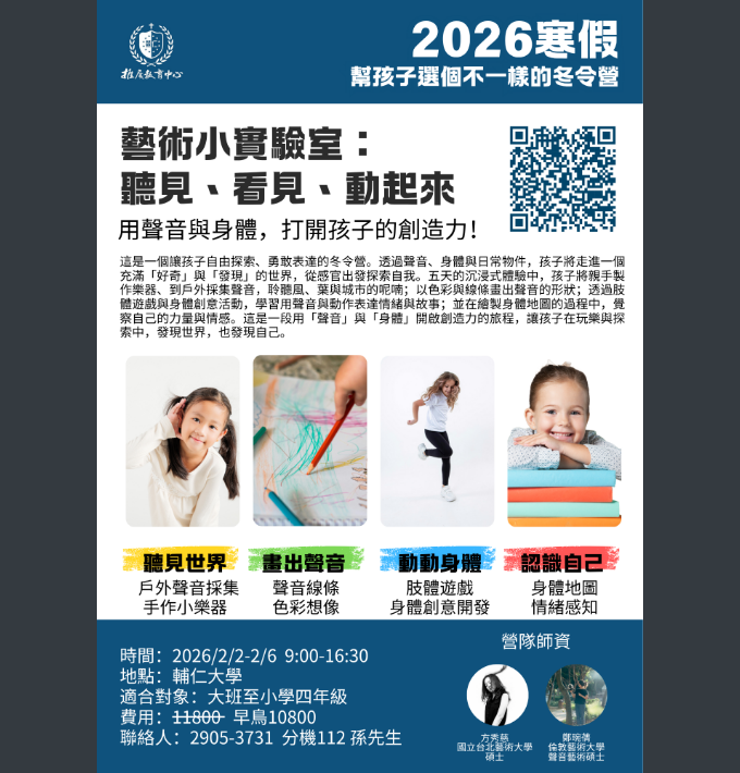 一、為協助教職員於寒假期間提供子女適齡且具創意啟發之活動,本中心辦理旨揭冬令營,以感官探索與藝術創作為主軸,內容包含聲音採集、色彩創作、肢體遊戲與自我感知等活動,期能促進學童表達力與創造力。