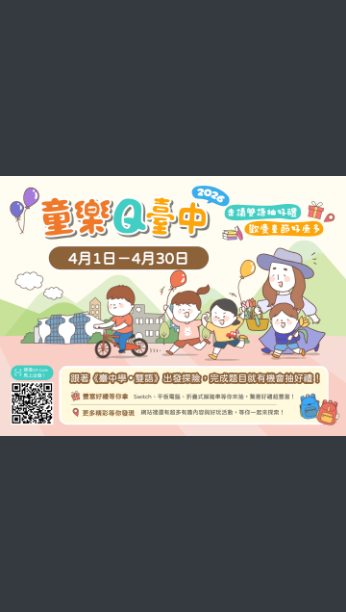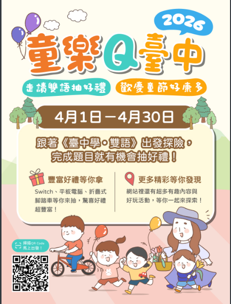 本次活動網站整合《臺中學.雙語》教材相關資源規劃建置,內容涵蓋在地場館、自然風貌、文史脈絡及雙語學習素材,並可參加答題抽獎活動。
