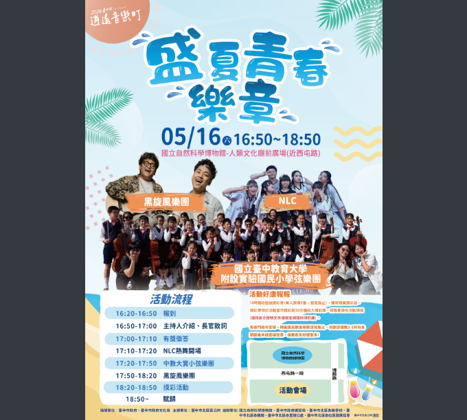 【轉知】臺中市北區區公所舉辦「2026臺中市北區逍遙音樂町─盛夏青春樂章」活動Post category:活動訊息Post published:2026/04/28Post author:ntctcpstc017說明:一、旨揭活動訂於115年5月16日(星期六)下午4時50分至6時50分假國立自然科學博物館-人類文化廳前廣場(近西屯路)辦理。二、本次活動特別邀請「NLC」、「中教大實小弦樂團」及「黑旋風樂團」等優質表演團體精彩演出,現場並設有政令宣導攤位,提供精美宣導品免費索取。此外,還規劃豐富多元的摸彩活動,誠摯邀請您攜家帶眷一同蒞臨,享受音樂饗宴、參與抽獎,共度歡樂時光! Post Views: 17Read more articles上一篇文章【轉知】內政部建築研究所辦理「2026全國綠建築繪畫徵圖比賽」下一篇文章【轉知】【競賽資訊】「第21屆龍顏FUN書獎」徵文辦法