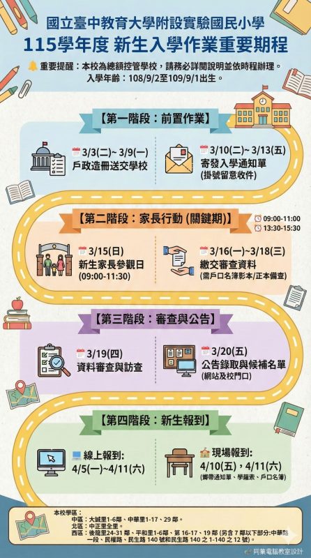 115學年度 新生入學作業重要期程Post category:置頂Hot! / 首頁公告區Post published:2026/03/02Post author:ntctcpstc026115年3月20日將公告新生正取及備取名單,請家長注意網頁公告115實小新生重要期程 Post Views: 512Read more articles上一篇文章公告國立臺中教育大學附設實驗國民小學114學年度第2學期第1次代理教師甄選【第5次招考】甄選結果下一篇文章115年3月15日Open House學校參觀日邀請您