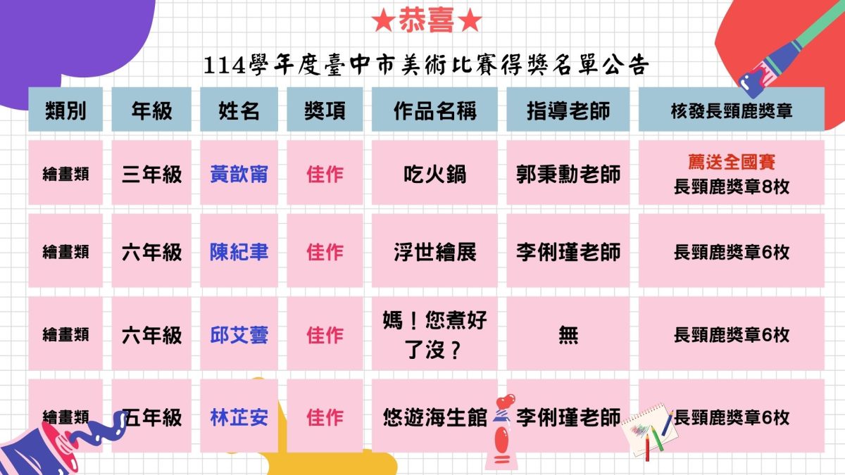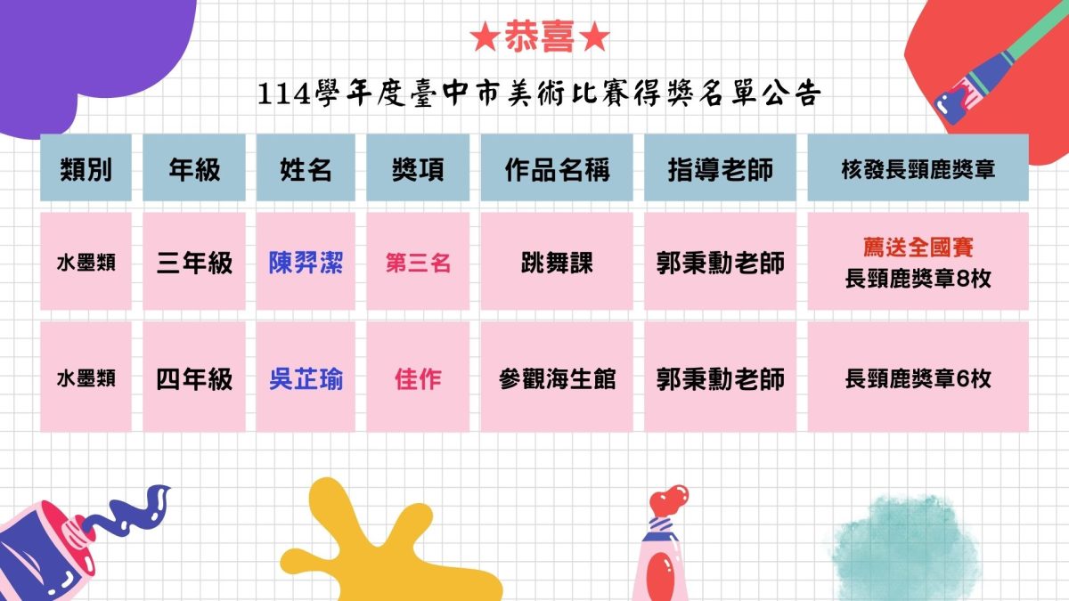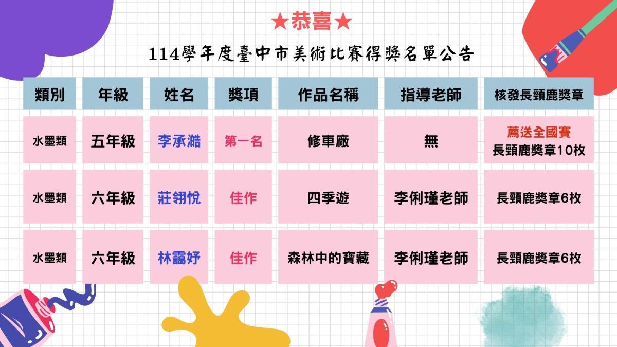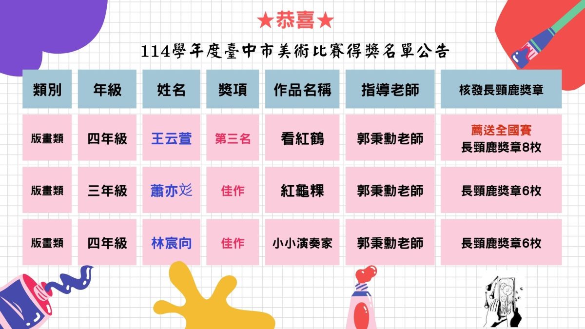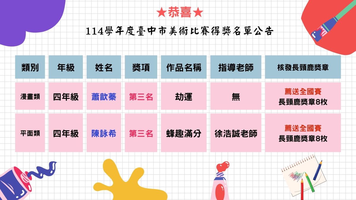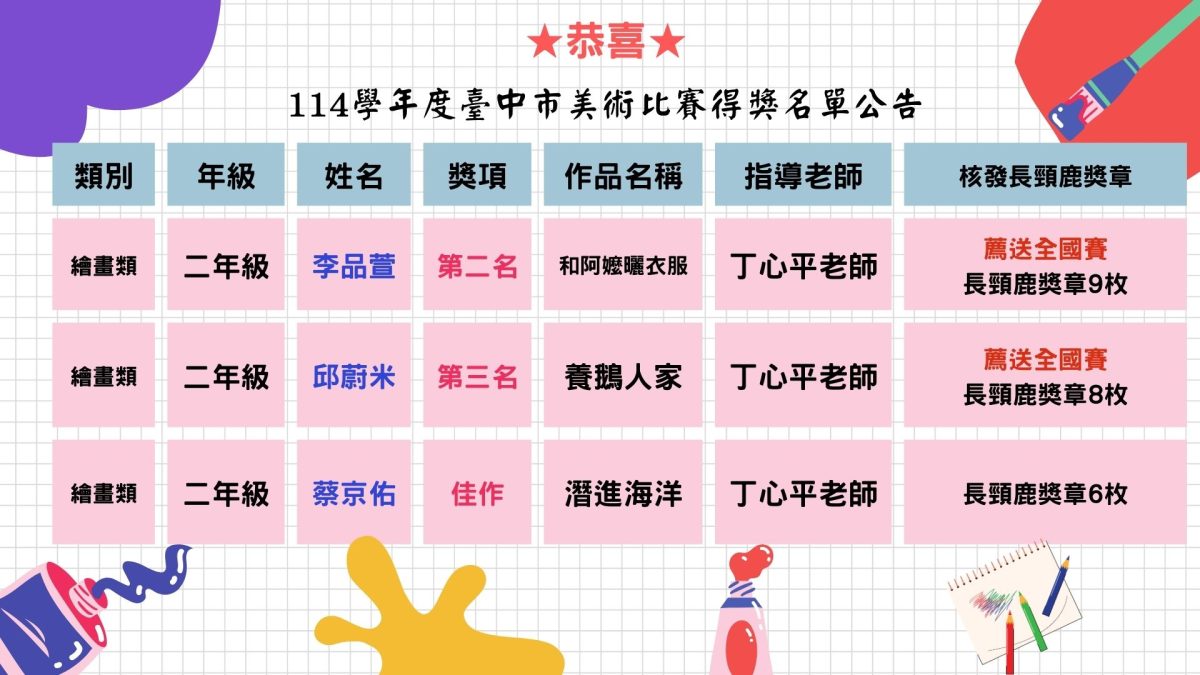 ★恭喜★ 114學年度臺中市美術比賽,實小畫家光彩奪目Post category:榮譽榜 / 置頂Hot!Post published:2025/11/25Post author:ntctcpstc016 Post Views: 62Read more articles上一篇文章★恭喜★第33屆全國兒童聯想創作畫比賽 初賽入選下一篇文章★恭喜★ 知識就是力量!實小閱讀好小子勇闖2025全國賽